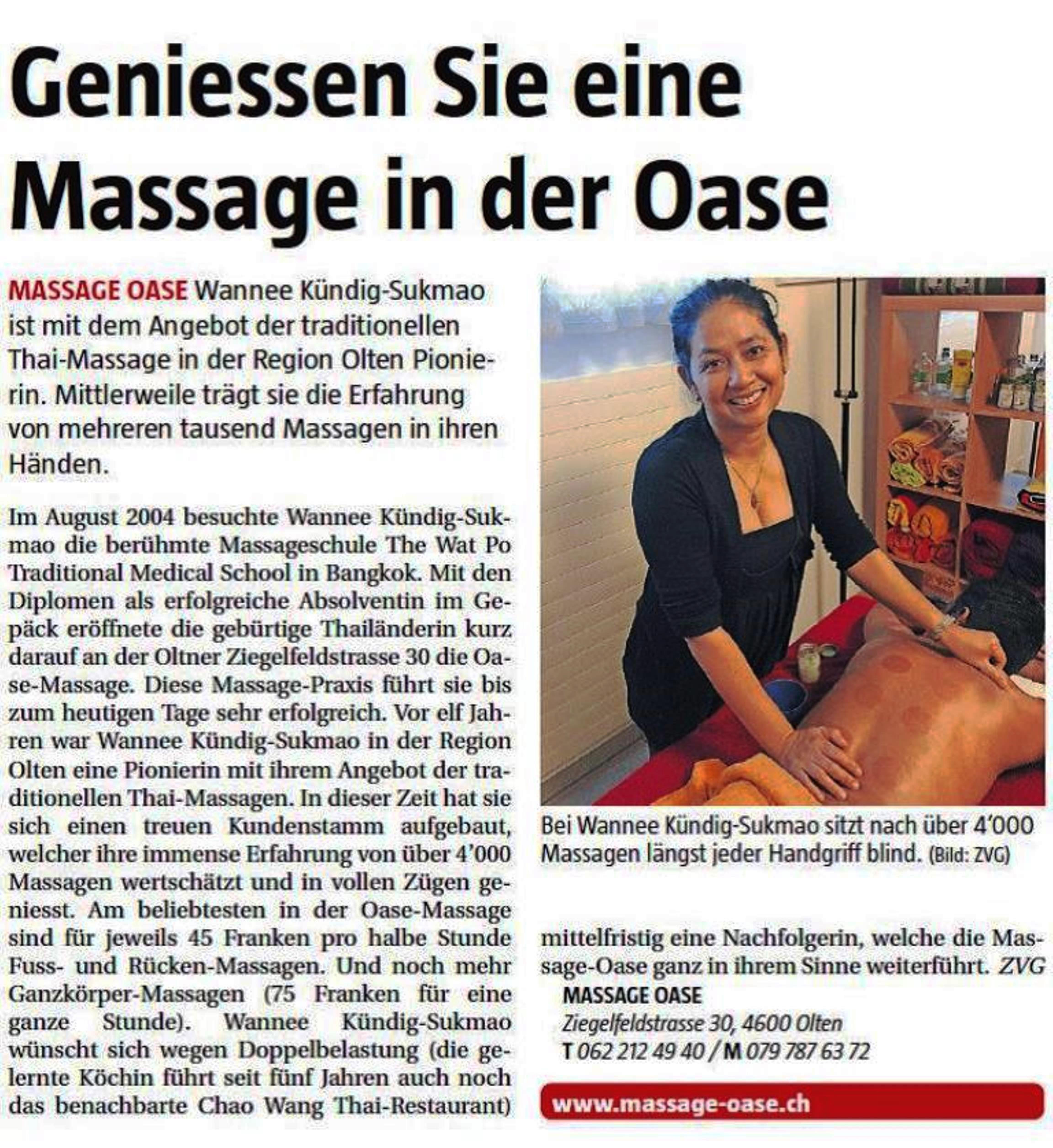 Stadtanzeiger Olten vom 26. November 2015 über die Massage-Oase: